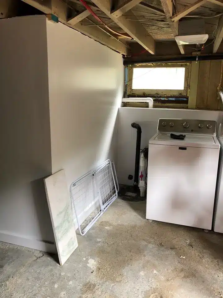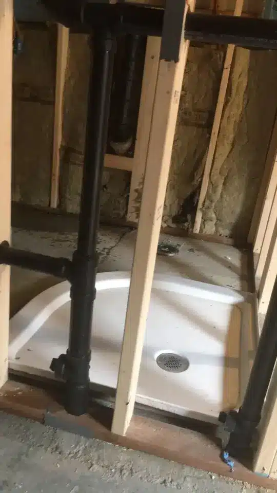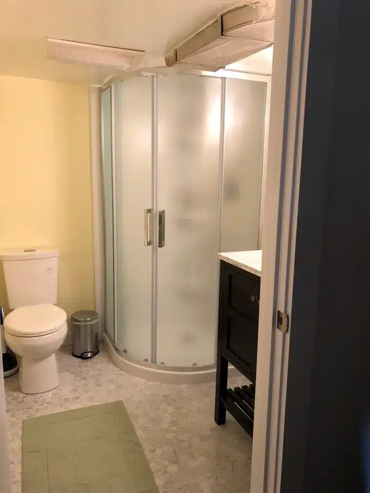 To create this basement bathroom, we walled it in and plumbed it. Pocket door and Marmoleum floor and a cute corner shower remodel.