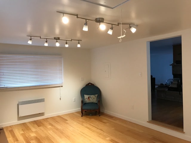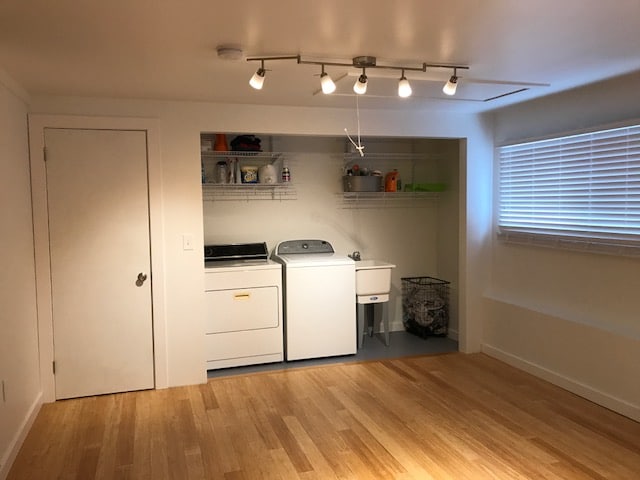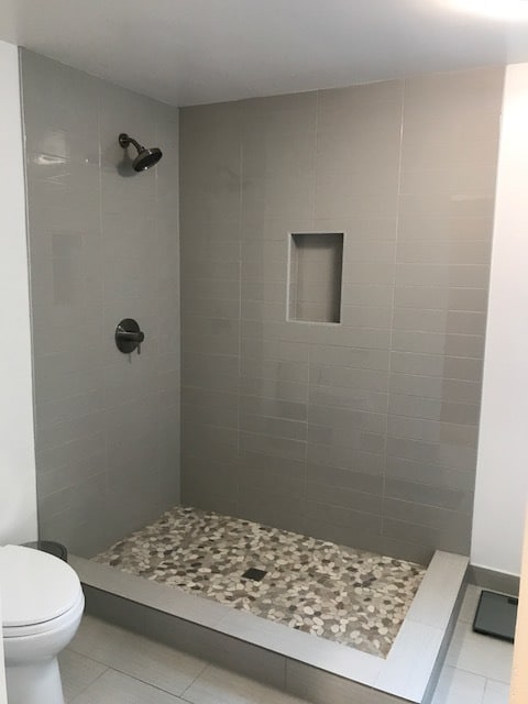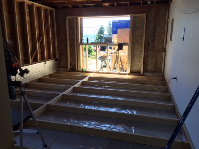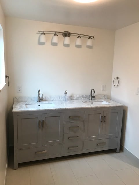 AmyWorks transformed a garage into a musical space! We fully renovated this garage, adding resilient click-lock bamboo flooring. The newly remodeled adjacent bathroom features a dual sink vanity and walk-in shower.