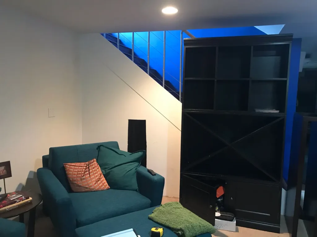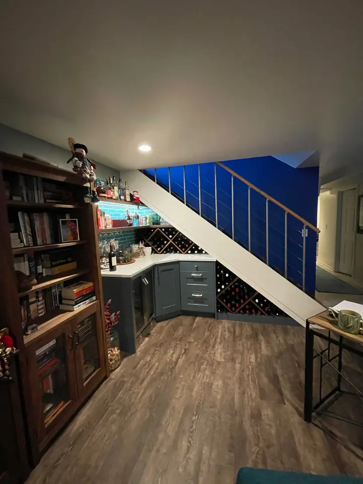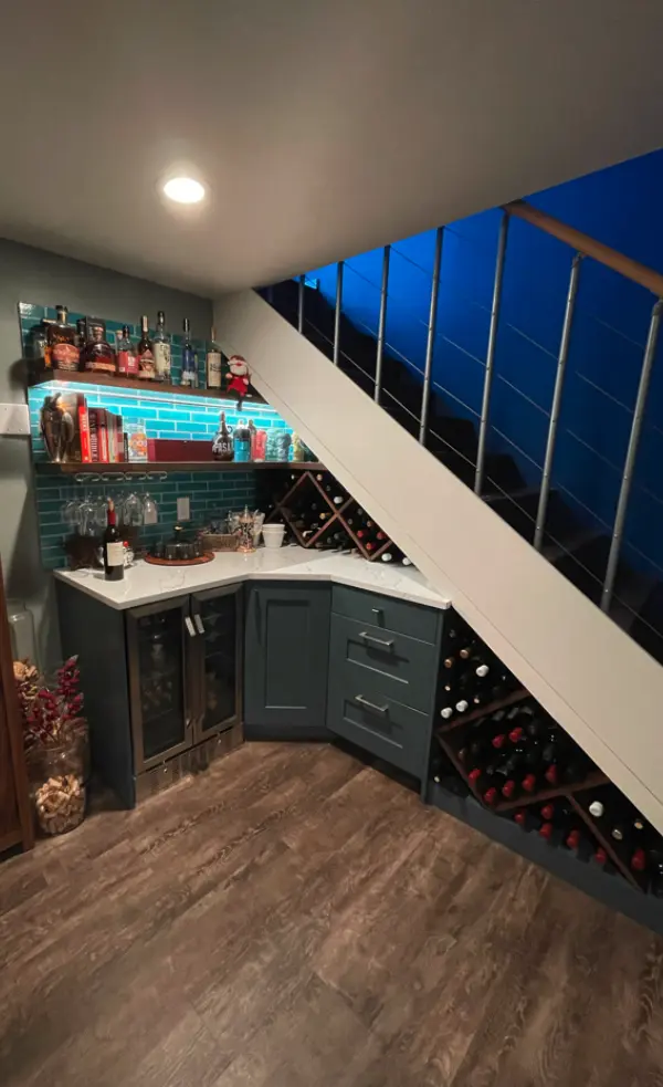We creatively made efficient use of space under the stairs adding industrial-style stair railing and lighting to replicate your favorite nightlife hangouts — remodeling with stylishly lit tile backsplash, built-in refrigeration, marble countertop, and luxurious interlocking vinyl plank flooring. What a way to accent your neglected dark corners!
