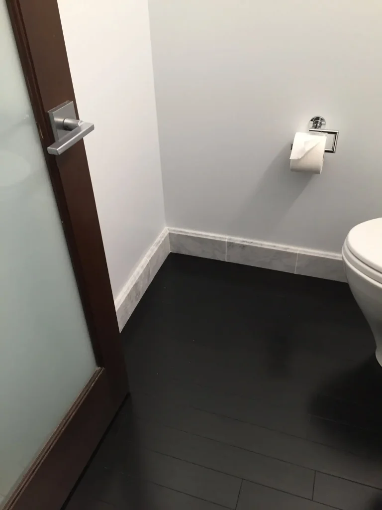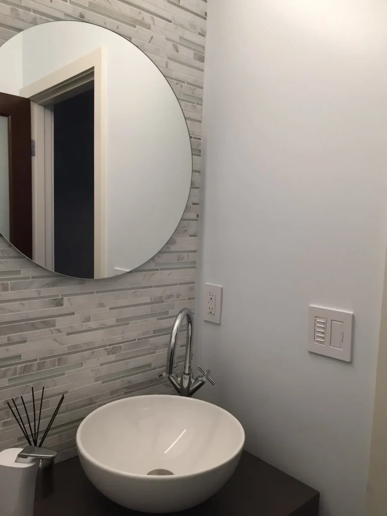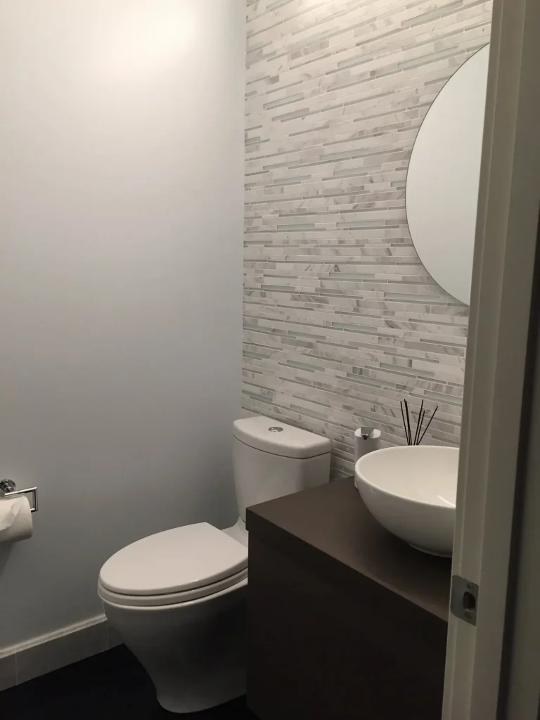 Abandoned by another contractor, this project was completed when AmyWorks swept in and finished the job! This remodeled bath includes new mosaic floor-to-ceiling tile, vessel sink, and marble baseboard. Mission accomplished!