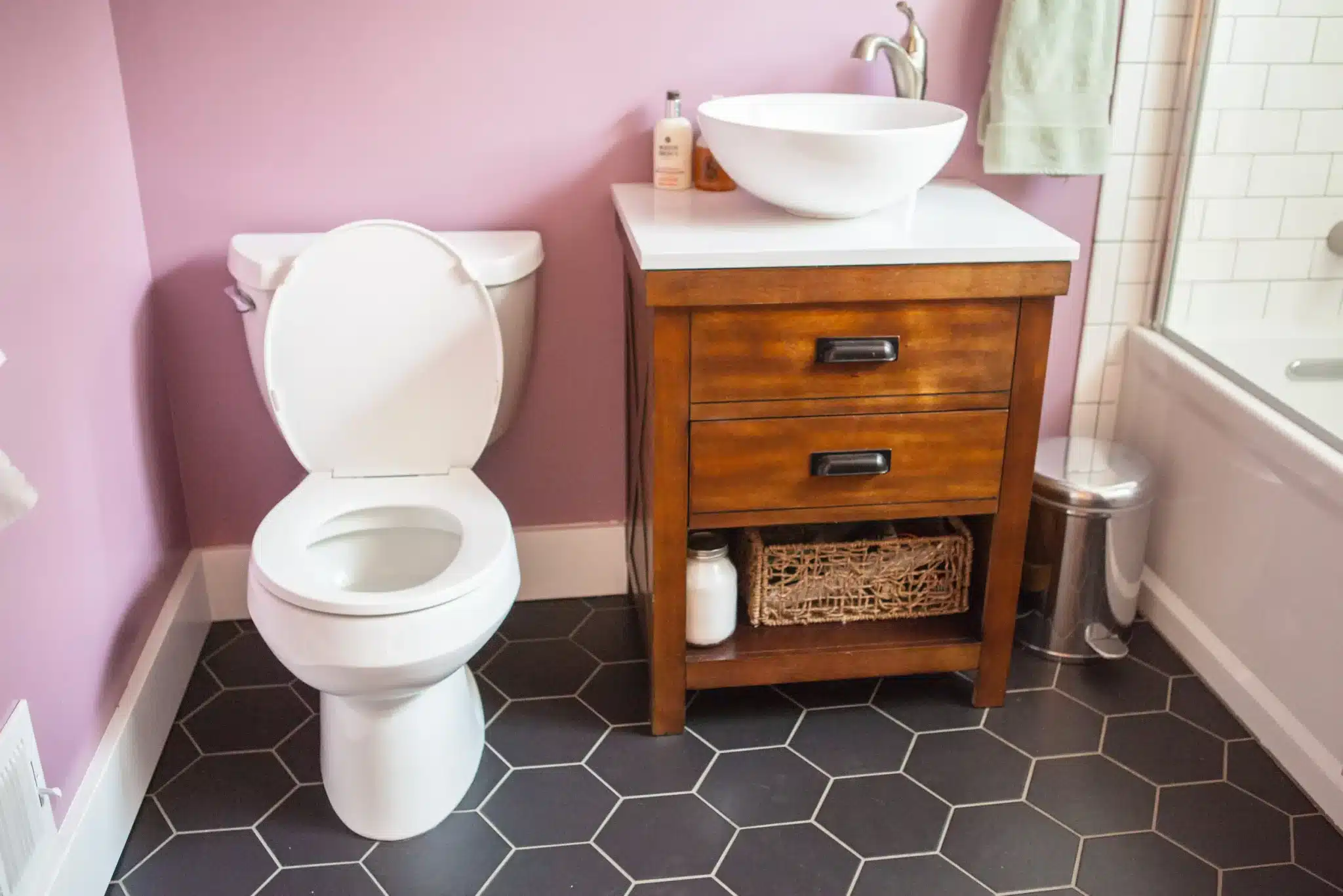 Wow, what an improvement! This small bathroom remodel includes floor-to-ceiling subway tile in the shower, a new gleaming deep tub, and a new vanity featuring a ceramic vessel sink.