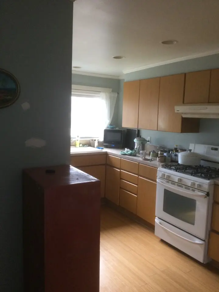 A kitchen makeover featuring updated stainless steel appliances including a cooktop, sink, and range hood transforms the heart of this home. Built-in cabinets refaced with glass doors and matching trim complete the renovation.