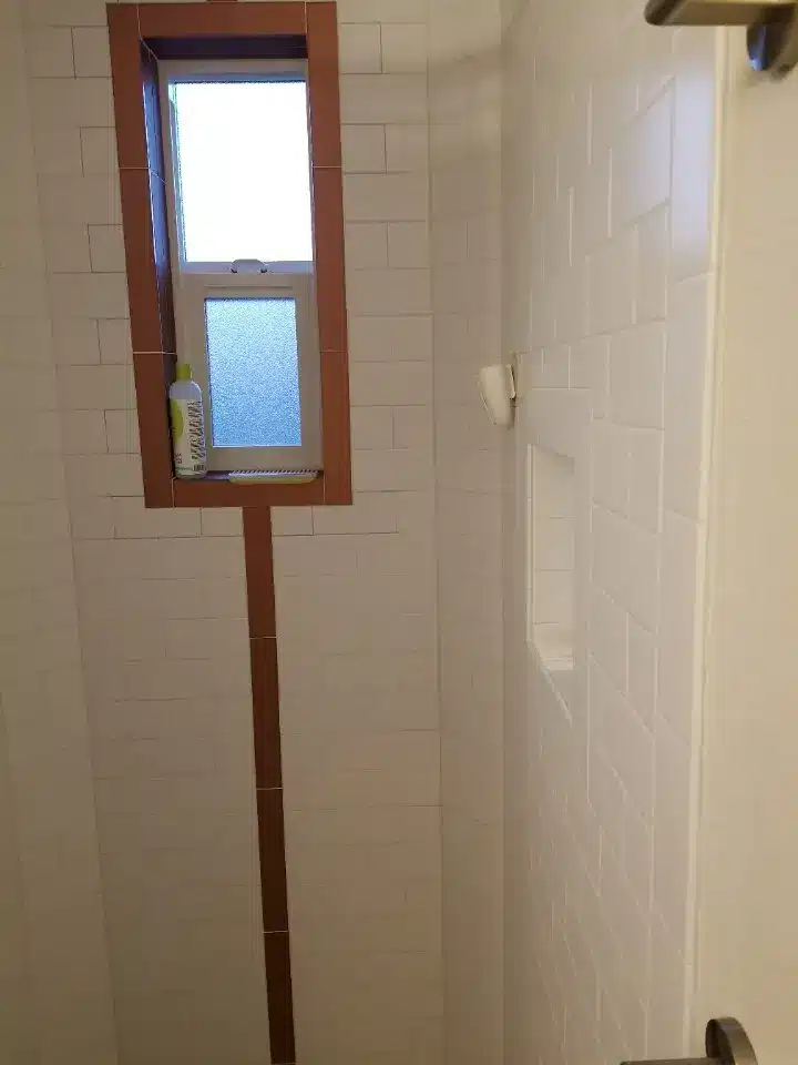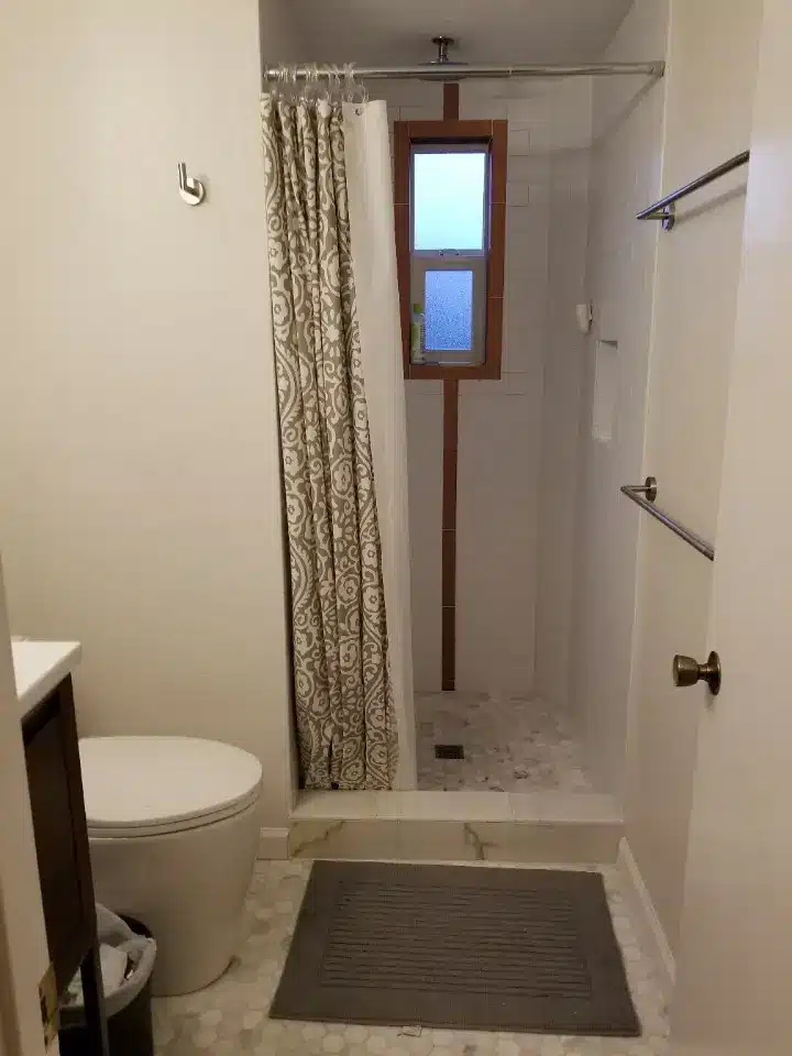 A new window, Wedi Shower System, Marble & Subway tile accents. This new bathroom remodel has a clean look, with a touch of color.